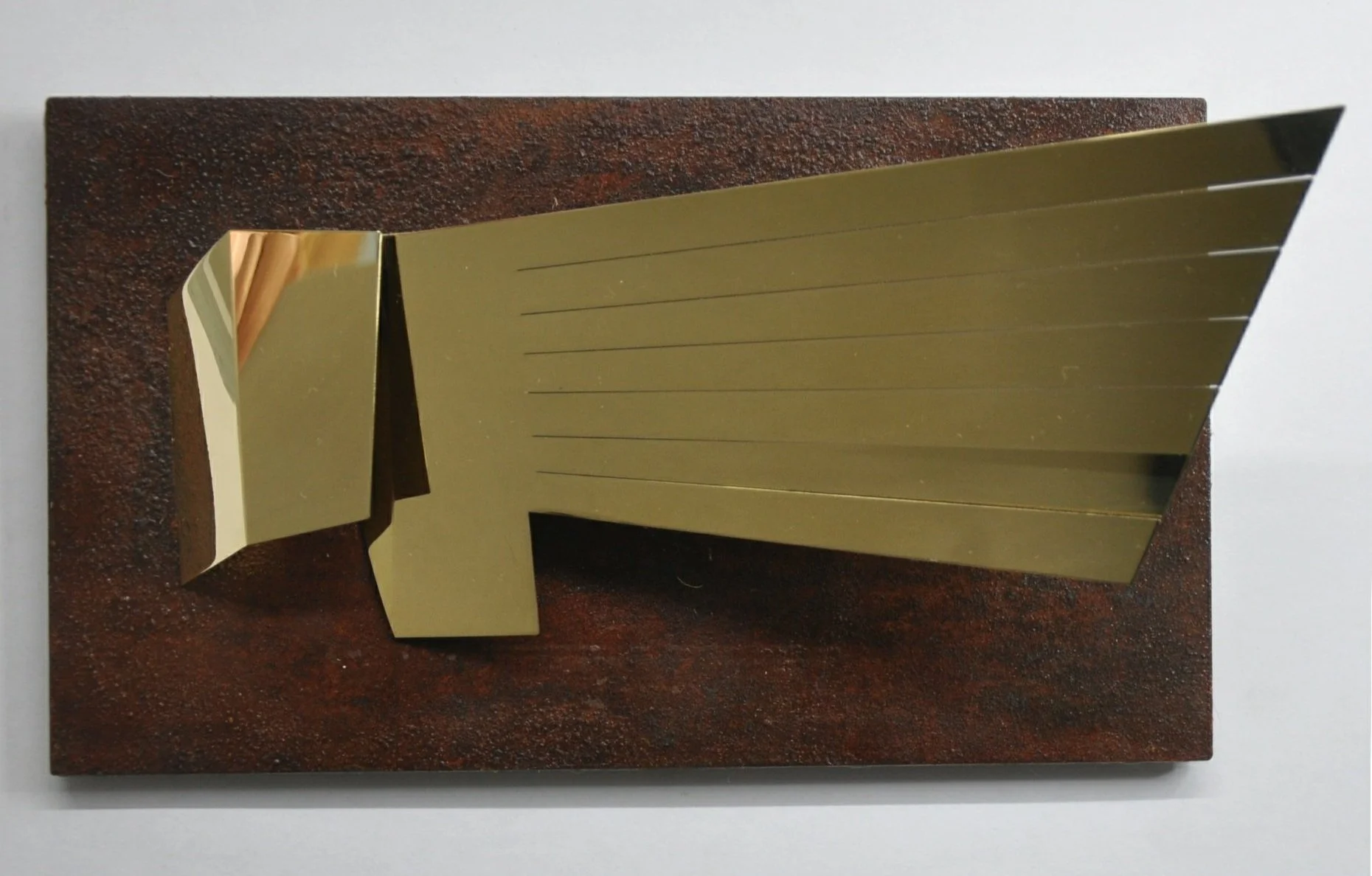Gold-colored metallic object mounted on a wooden plaque, resembling a stylized fish or whale with engraved lines on the body.